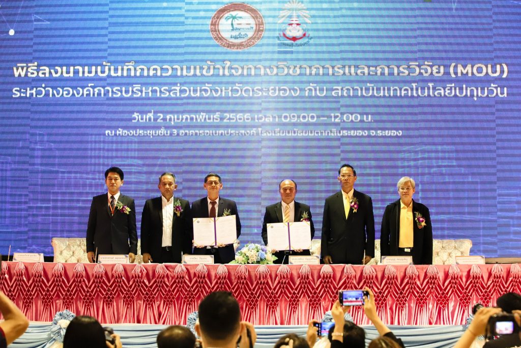 วันพฤหัสบดีที่ 2 กุมภาพันธ์ 2566 เวลา 09.00 น. ณ ห้องประชุมชั้น 3 อาคารอเนกประสงค์ โรงเรียนมัธยมตากสินระยอง จังหวัดระยอง สถาบันเทคโนโลยีปทุมวัน โดย รองศาสตราจารย์ ดร.เสถียร ธัญญศรีรัตน์ อธิการบดี ลงนามความเข้าใจทางวิชาการและการวิจัย ระหว่างองค์การบริหารส่วนจังหวัดระยอง และ สถาบันเทคโนโลยีปทุมวัน ร่วมกับ นายปิยะ ปิตุเตชะ นายกองค์การบริหารส่วนจังหวัดระยอง ในการ งานเปิดบ้านอาชีวะยุคใหม่ ก้าวไกลสู่ EEC ทั้งนี้เพื่อเป็นการประสานความร่วมมือในการพัฒนาการจัดการอาชีวศึกษาให้ตอบสนองต่อการผลิต และพัฒนากำลังคนตามความต้องการของสถานประกอบการในเขตพัฒนาพิเศษภาคตะวันออก EEC เพื่อเปิดโอกาศให้นักเรียน นักศึกษาในจังหวัดระยองที่มีความสนใจศึกษาต่อในสายวิชาชีพ โดยมีการจัดนิทรรศการประชาสัมพันธ์วิทยาลัยเทคโนโลยี อาชีวศึกษาตากสินระยอง สถาบันเทคโนโลยีปทุมวัน และสถานประกอบการมีการนำเสนอเทคโนโลยีสมัยใหม่แนะแนวการศึกษาต่อเพื่อให้ความรู้ด้านอาชีพ แก่ผู้ที่สนใจต่อไป