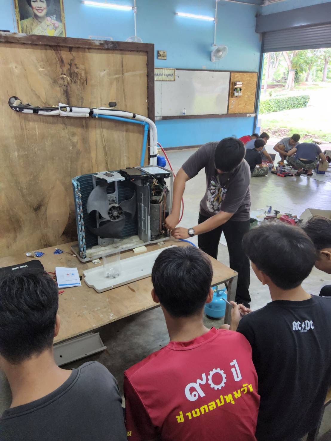 เมื่อวันที่ 14 และ 17 กรกฎาคม 2566 คณะวิศวกรรมศาสตร์ สถาบันเทคโนโลยีปทุมวัน ดำเนินโครงการพัฒนาคุณภาพการศึกษาและพัฒนาท้องถิ่นโดยมีสถาบันเทคโนโลยีปทุมวันเป็นพี่เลี้ยง นำโดย อาจารย์มินเรศน์ เตชะวงศ์ และนายวรภูมิ แพเจริญสุด ร่วมกับคณะครู นักเรียนโรงเรียนร่มเกล้า กาญจนบุรี จัดกิจกรรมพัฒนาผู้เรียนเพื่อส่งเสริมทักษะการซ่อมบำรุงติดตั้งเครื่องปรับอากาศ ให้แก่นักเรียนระดับชั้นมัธยมศึกษาปีที่ 4 – 6 จำนวน 20 คน ณ โรงเรียนร่มเกล้า กาญจนบุรี จังหวัดกาญจนบุรี เป็นกิจกรรมด้านช่างเทคนิคไฟฟ้า เพิ่มพูนทักษะการซ่อมบำรุงให้กับนักเรียนผู้ร่วมกิจกรรม สามารถนำไปใช้ประโยชน์ในชีวิตประจำวันได้